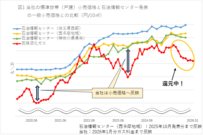 ポイント☝:原料輸入価格のガス料金への反映を2ヶ月空けることにより、次月の調整額を検針時にお知らせが可能となります。(12月の原料輸入価格は1月末に発表されるため、2月検針時に次月(3月)の調整額としてお知らせが可能となります。)