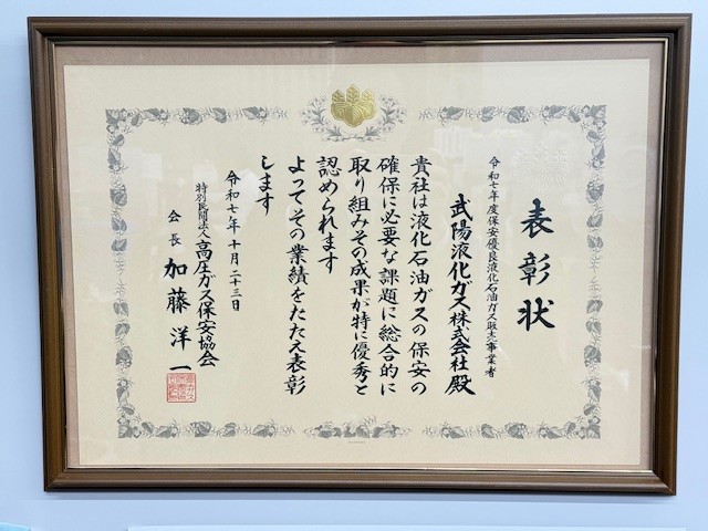 2025年10月23日(木)、令和7年度LPガス消費者保安推進大会にて保安優良液化石油ガス販売事業者表彰(高圧ガス保安協会長表彰)を2020年・2021年・2022年・2023年・2024年に引き続き受賞しました。