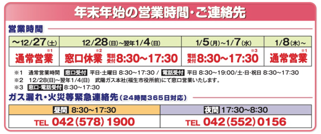 平素は、武陽液化ガスをご愛顧賜り誠にありがとうございます。 年末年始の営業時間及びご連絡先は下記の通りになります。 ご不便をお掛けいたしますが、何卒ご理解賜りますようお願い申し上げます。
